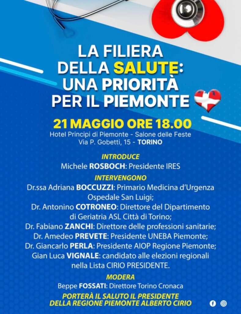 Carlo Perla presidente dell’ AIOP Piemonte (Associazione Italiana Ospedalità Privata), l’organizzazione datoriale aderente a Confindustria che nella regione conta 34 realtà, per circa 3.500 letti sarà relatore ad un importante convegno sulla Sanità Regionale dal Titolo “La Filiera della Salute una priorità per il Piemonte” in programma martedì prossimo, 21 maggio nel salone delle feste del prestigioso hotel “Principe di Piemonte” a Torino.
