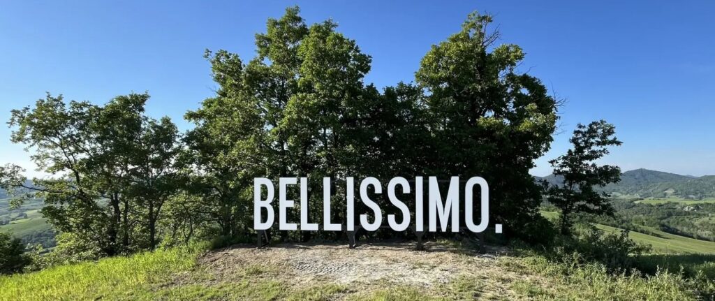 L’opera di Alvigini, che richiama le grandi installazioni visive come quella di “Hollywood”, si distingue per il modo in cui celebra il paesaggio tortonese, un’area famosa tanto per le sue bellezze naturali quanto per la ricchezza delle sue tradizioni enogastronomiche e sportive. La scelta di una singola parola, “Bellissimo.”, incisa con fermezza e sottolineata da un punto fermo, riflette l’ambivalenza con cui l’artista affronta il concetto di bellezza nell’arte contemporanea.