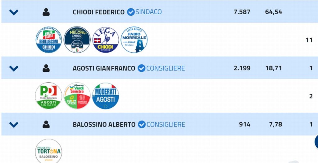 Per la terza volta (e la seconda in poche ore) , Federico Chiodi aggiorna la storia di Tortona: il giorno dopo le elezioni la sua vittoria assume contorni ancora più schiaccianti e incredibili perché ottenendo più del 60% dei consensi la sua maggioranza guadagna un consigliere in più e rispetto ai 10 dello scorso mandato ne ottiene 11 togliendone uno alla minoranza: il consigliere andrà a Forza Italia che ne fa 4, mentre tre andranno a Fratelli d’Italia e Lega e uno alla Lista Morreale. Non solo ma la sua scelta di candidare tante donne ha portato ad un risultato inaspettato: per la prima volta nella storia di Tortona cinque donne vengono elette direttamente in Consiglio comunale, come potrete leggere di seguito perché pubblichiamo l’elenco completo di quanti voti ha preso ogni tortonese candidato in Comune e chi entrerà in Consiglio Comunale alla luce delle probabili scelte sugli assessori fatte da Federico Chiodi che ci sentiamo di anticipare.