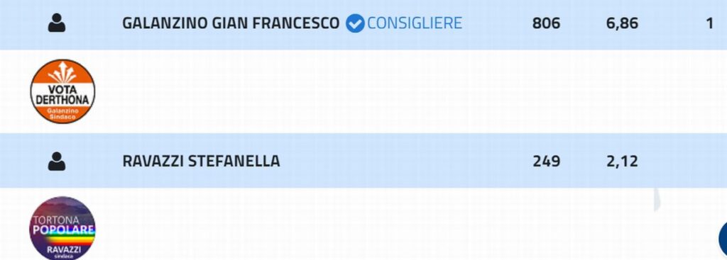 La lista “Tortona Popolare” che aveva come Candidato Sindaco Stefanella Ravazzi con solo 249 voti par al 2,12% non ottiene alcun seggio. Tra l’altro non ha raggiunto neppure la percentuale di sbarramento del 4%.