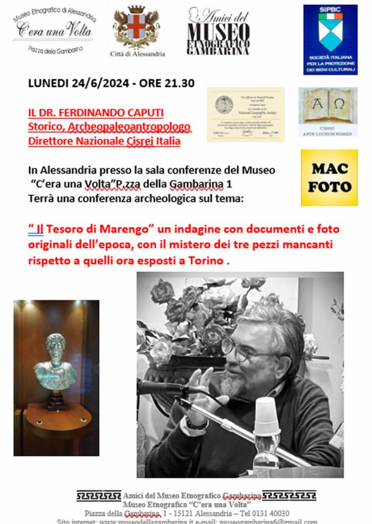 24/6/2024 ore 21.30 presso il Museo della Gambarina: “Il Tesoro di Marengo” analisi di una scoperta fortuita e tutto quello che ne conseguì tra cui anche la probabile scomparsa di alcuni pezzi. Attraverso una ricerca accurata su documenti dell’epoca e la testimonianza di alcuni discendenti degli scopritori che nel 1928 lo trovarono alla cascina Pederbona, arricchiremo la cronaca di questo importantissimo ritrovamento, non contemplata neanche nell’ultima pubblicazione.