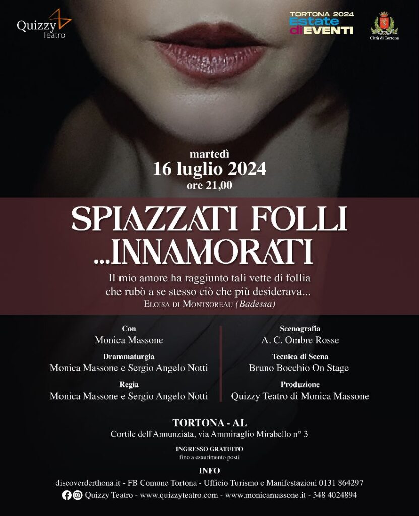 Martedì 16 luglio alle ore 21 nel Cortile dell’Annunziata, nell’ambito di Estate di Eventi, sarà presentato in anteprima lo spettacolo “Spiazzati, Folli…Innamorati”, con Monica Massone, una pièce originale scritta e diretta dalla stessa Massone, in collaborazione con Sergio Angelo Notti, prodotta da Quizzy Teatro.