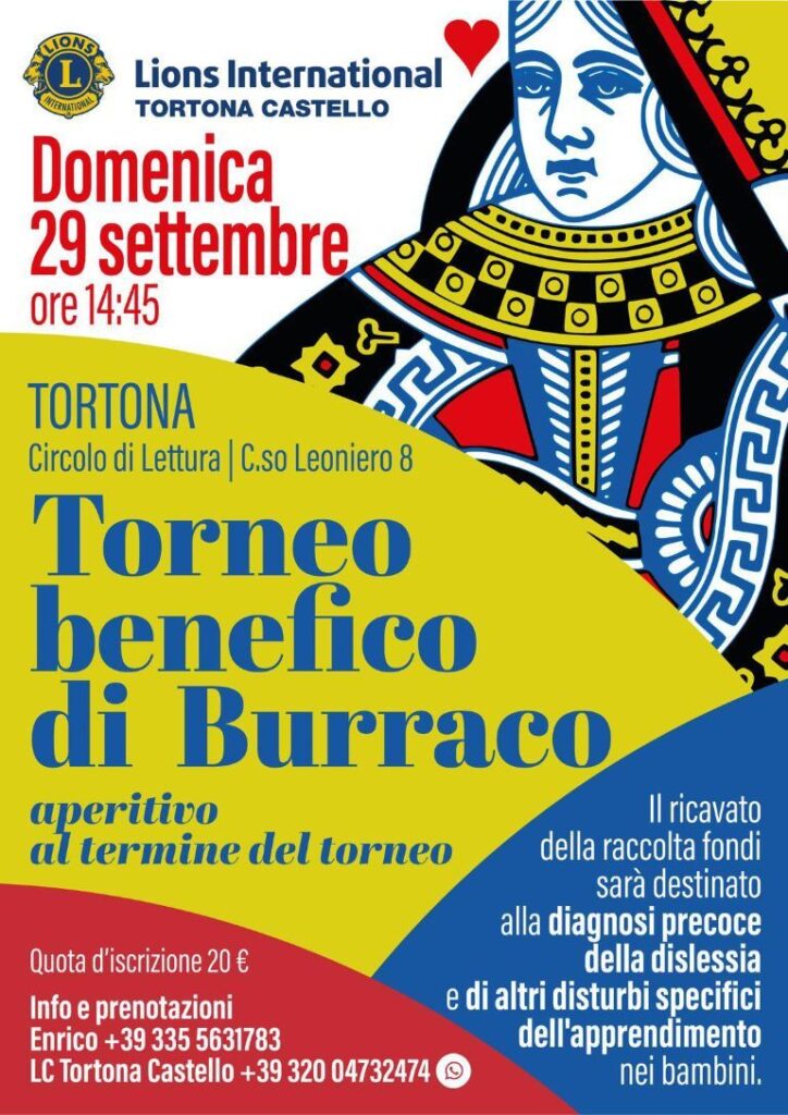 Il L.C. Tortona Castello invita i giocatori e le giocatrici di burraco ad iscriversi al torneo benefico di domenica 29 settembre, al Circolo di Lettura, per contribuire al progetto di uno screening rivolto a scolari delle classi seconde, che sarà effettuato da psicologi specializzati nell’anno scolastico 2024-25 per individuare i bambini a rischio e avviare una diagnosi precoce. I successivi interventi didattici mirati eviteranno gli insuccessi scolastici e i disagi emotivi conseguenti.