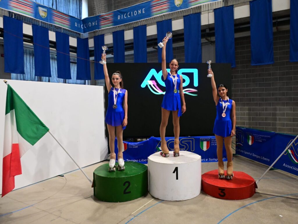 Primo posto medaglia d’oro quindi campionessa nazionale acsi Pattinaggio artistico Beatrice Basilio, secondo posto argento Bianca Balduzzi, terzo posto bronzo Virginia Tresin. Le tre ragazze sono tutte e tre del 2011 frequentano le scuole medie a Tortona.