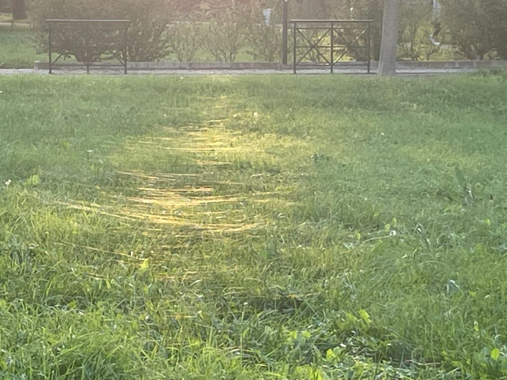 Ci riferiamo ovviamente ai ragni che tessono le loro ragnatele tra l’erba. Non si tratta delle solite ragnatele sull’erba umida di rugiada mattutina che possono essere un sintomo di un problema più grande chiamato fungo del dollaro ma bensì di sottili filamenti che si possono vedere solo controluce e noi le abbiamo notate nel parco in via Emilia nord.