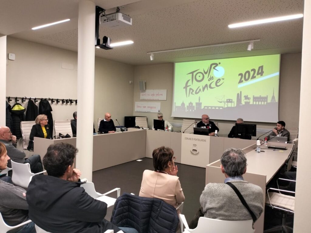 Sul maxi schermo della sala molte foto scattate da concittadini e numerosi video realizzati con droni, hanno ripercorso a ritroso il bellissimo evento, riproponendo il gioioso e trepidante impegno dell’allestimento del gigantesco puzzle di 100 metri quadri con un inedito Don Orione in bicicletta, realizzato dalla prof. Lucia Conte, l’infioratura della via Emilia con le centinaia di fiorelloni gialli di carta crespa preparati da un gruppo di signore del paese, i chilometri e chilometri di bandierine gialle, gli stendardi con il logo creato dall’artista Fabrizio Falchetto, le tantissime biciclettone gialle di legno realizzate dal falegname Flavio Fiaccone, le vetrine dei negozi tutte a tema Tour, il posizionamento dei volontari della Protezione civile e di tanti altri volontari. E ancor prima, la venuta in paese del famoso giornalista Fabio Conti, a presentare il suo libro “Il giallo del Tour”, con l’amico Faustino Coppi, la mostra di cimeli e biciclette realizzata dall’ Associazione ciclistica pontecuronese.