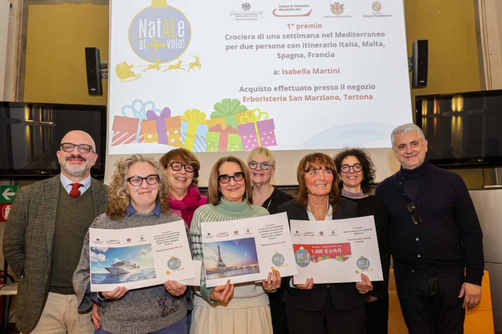 Sono state premiate oggi, giovedì 6 febbraio 2025 presso la Camera di Commercio di Alessandria-Asti le vincitrici dei 3 premi finali ad estrazione del gioco-concorso Natale al Volo ideato da Confcommercio della Provincia di Alessandria con il supporto della Camera di Commercio di Alessandria-Asti e del Comune di Alessandria e con il patrocinio del Comune di Casale Monferrato e il primo premio è andato ad una Tortonese: Isabella Martini che ha vinto Una crociera di una settimana nel Mediterraneo per due persone con itinerario Italia, Malta, Spagna, Francia grazie ad un acquisto fatto in erboristeria a Tortona.
