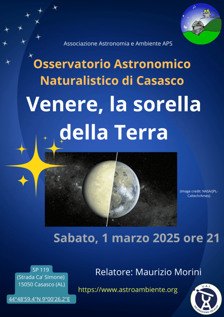 Sabato prossimo, 1 marzo alle 21 alle prenderà il via l’attività pubblica con la prima conferenza dal titolo “Venere, la sorella della Terra”.