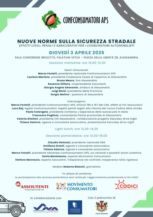 GIOVEDÌ 3 APRILE nella Sala Broletto di Palatium Vetus in piazza della Libertà, ad Alessandria, il convegno NUOVE NORME SULLA SICUREZZA STRADALE: EFFETTI CIVILI, PENALI E ASSICURATIVI PER I CONSUMATORI AUTOMOBILISTI