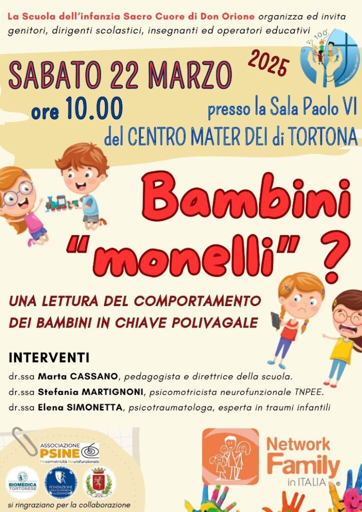 La Scuola Materna “Sacro Cuore” Don Orione di Tortona, organizza un incontro formativo sabato 22 marzo 2025 alle ore 10 presso la Sala Paolo VI del Centro Mater Dei dal titolo: Bambini “monelli”?. Una lettura del comportamento dei bambini in chiave polivagale. Relatrici dell’incontro le dr.sse Stefania Martignoni, psicomotricista ed Elena Simonetta, psicotraumatologa. “Un incontro di continuità al percorso formativo iniziato lo scorso anno, spiega la dr.ssa Marta Cassano direttrice della Scuola Materna, che rientra inoltre nel piano famiglia del Comune e che si realizza grazie alla preziosa collaborazione oltre al nostro Comune di Tortona, dell’Associazione Psine, della Biomedica Tortonese, della Fondazione CR Alessandria”. L’incontro è rivolto particolarmente ai genitori, dirigenti scolastici, insegnanti ed operatori educativi.