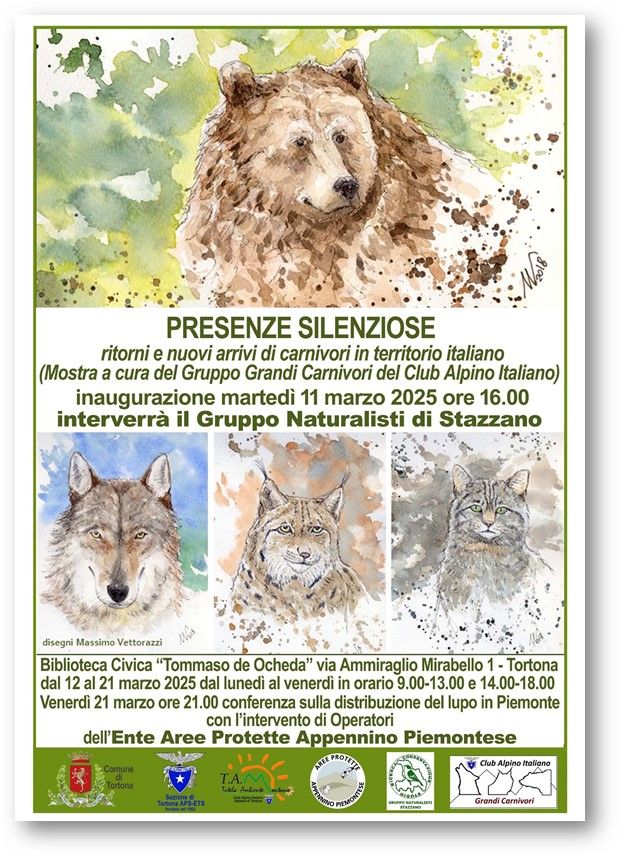 Da martedì 11 a venerdì 21 marzo sarà possibile visitare a Tortona, presso la Biblioteca Civica “Tommaso de Ocheda” in via Ammiraglio Mirabello 1, la mostra “Presenze silenziose, ritorni e nuovi arrivi di carnivori in territorio italiano”, proposta dalla locale Sezione del Club Alpino Italiano.