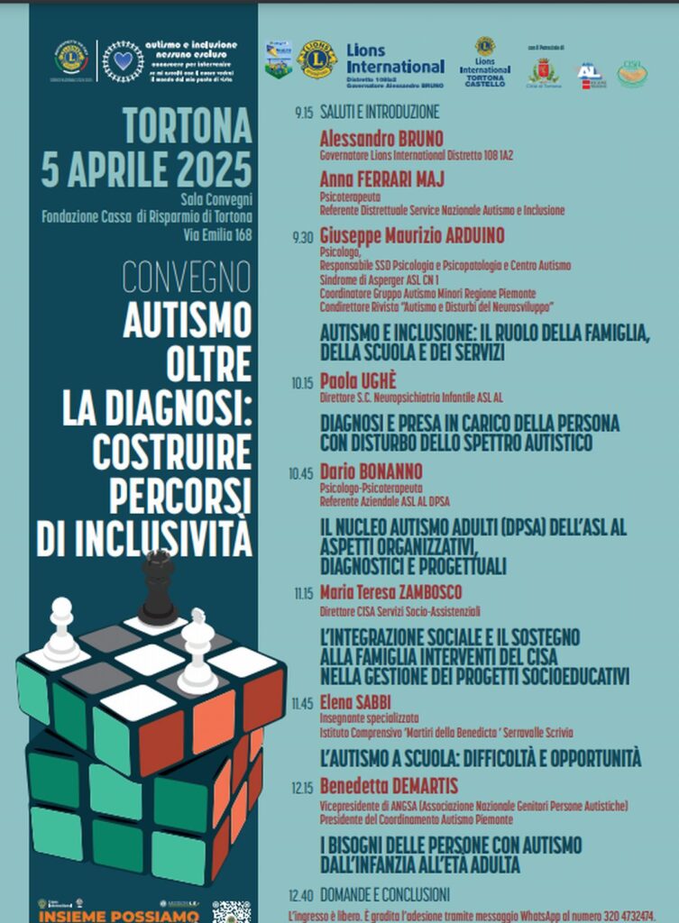 Conoscere e riconoscere questa particolare “non malattia” non è facile, per la sua situazione diagnostica complessa e di difficile risoluzione. Molto delicati anche gli interventi per aiutare chi è affetto da autismo. Per questo presso la Sala Convegni Fondazione Cassa di risparmio di Tortona, sabato 5 aprile si tiene il convegno Autismo oltre la diagnosi: costruire percorsi di inclusività, dedicato al confronto e alla riflessione su autismo e inclusione, tema lionistico nazionale e distrettuale, organizzato dal Lions Club Tortona Castello. Lo scopo del convegno, che richiama la giornata internazionale della consapevolezza dell’autismo (2 aprile), è infatti quello di contribuire efficacemente alla campagna di sensibilizzazione sui disturbi dello spettro autistico, per promuovere un cambiamento culturale che vada oltre l’integrazione e assicuri a ogni persona di vedere riconosciuta, rispettata e valorizzata la propria diversità. Il convegno è aperto alla cittadinanza, agli autistici e alle loro famiglie, agli operatori sanitari e sociali, alle associazioni e ai centri che si occupano delle persone affette da autismo.