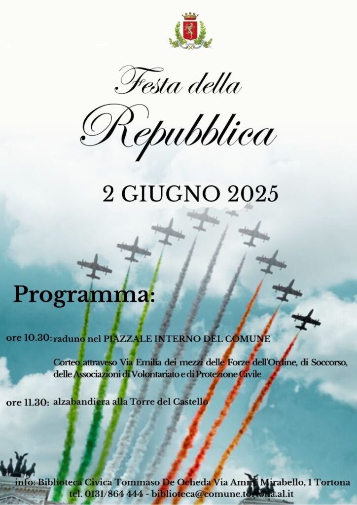 Lunedì 2 giugno si celebra la Festa della Repubblica e il Comune di Tortona organizza la consueta cerimonia che coinvolge tutte le Forze dell’Ordine, le associazioni di volontariato, di Protezione Civile e di soccorso. Il programma prevede, alle ore 10.30, il raduno dei mezzi nel piazzale interno del Municipio in corso Alessandria 62; seguirà il corteo dei mezzi attraverso via Emilia, per raggiungere poi il Castello dove, alle 11.30, presso la Torre, si terrà la cerimonia dell’alzabandiera.