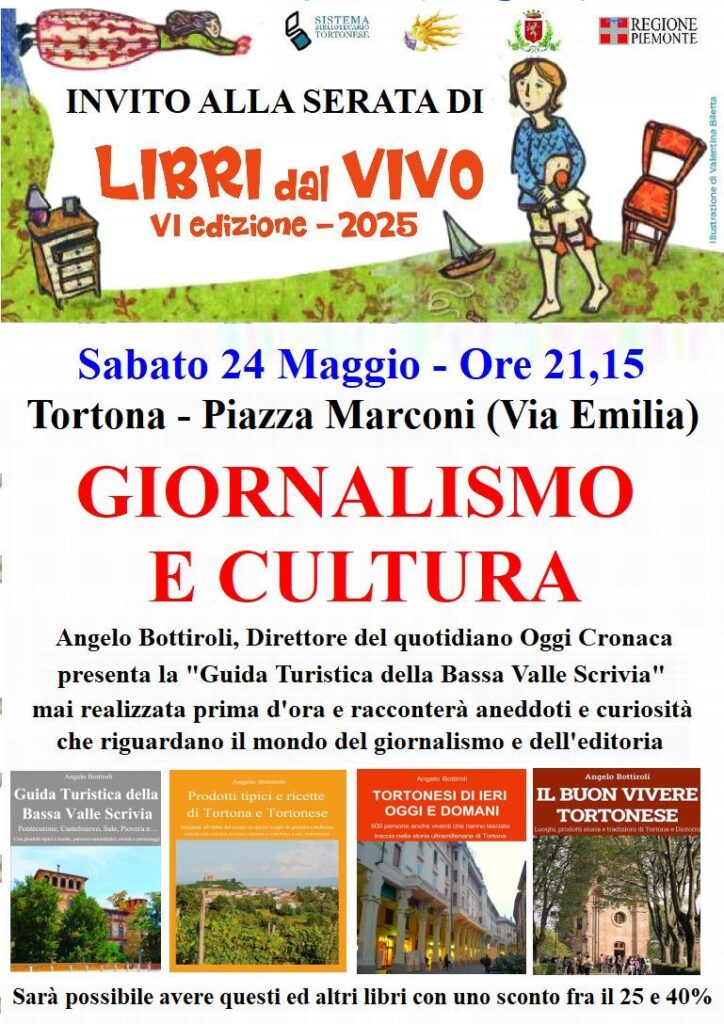 Sarà un sabato sera spumeggiante quello in programma il 24 maggio a Tortona: insieme ai banchetti e alle iniziative di “Assaggia Tortona” che animeranno il centro storico cittadino fino alle 23, lungo l’asse della via Emilia, in piazza Marconi a fianco di Piazza Arzano, conosciuta dai Tortonesi come piazza della Merì alle 21,15 si terrà un’incontro pubblico dal titolo “Giornalismo e Cultura” con Angelo Bottiroli, direttore di Oggi Cronaca che dopo aver molto succintamente presentato il suo 14esimo libro dal titolo “Guida Turistica della Bassa valle Scrivia” opera mai scritta prima e interamente dedicata questa zona del Tortonese, racconterà aneddoti e curiosità che riguardano il mondo del giornalismo e dell’informazione, rispondendo tutte le domande dei presenti inerenti questi tempi.