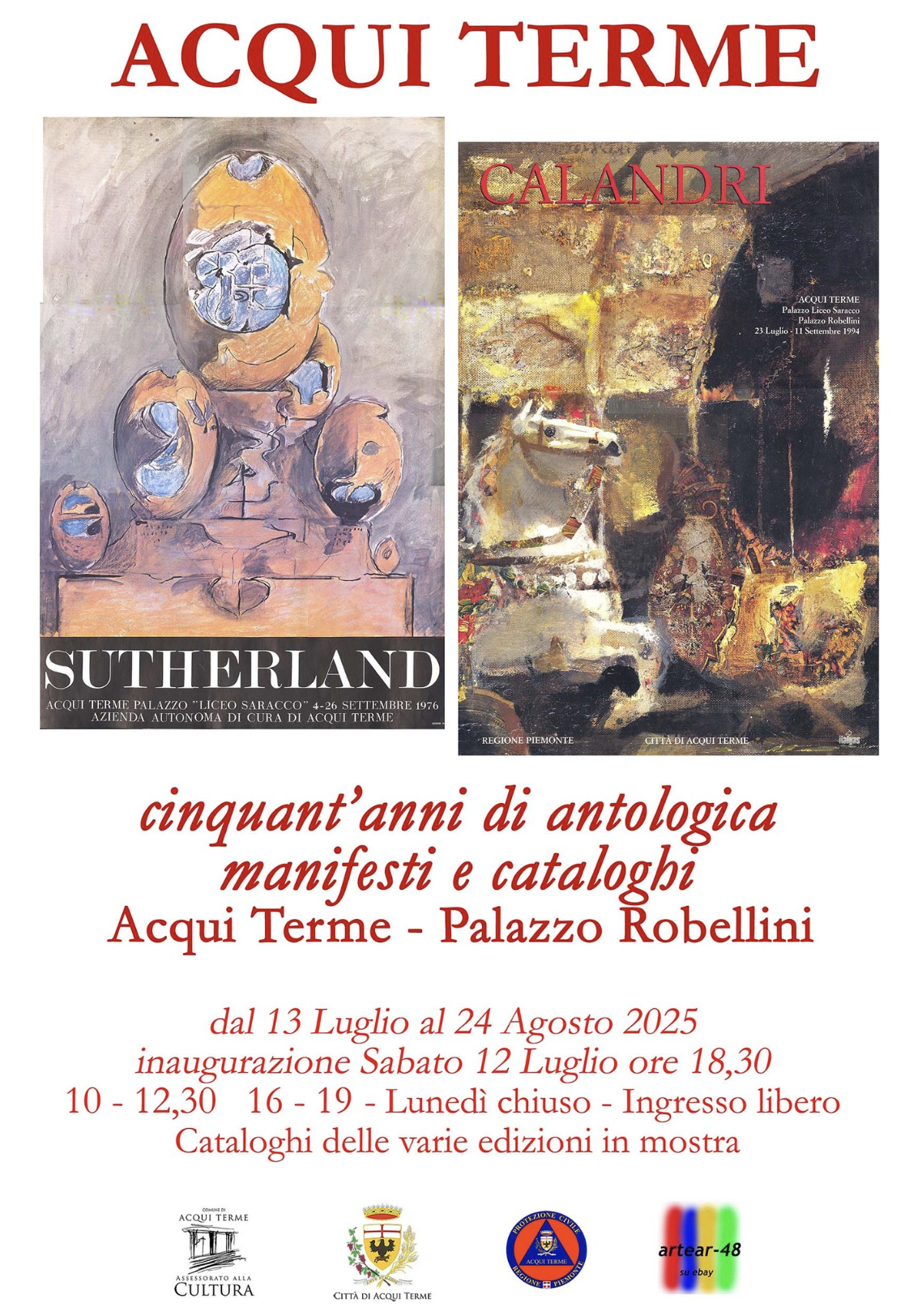 | L’Assessorato alla Cultura della Città di Acqui Terme è lieto di annunciare l’apertura della mostra “Cinquant’anni di Antologica – Manifesti e Cataloghi”, allestita presso Palazzo Robellini, Piazza Levi 5, Acqui Terme dal 13 luglio al 24 agosto 2025 con orario da martedì a domenica 10:00–12:30 e 16:00–19:00 (lunedì chiuso) – ingresso gratuito. L’esposizione rappresenta un viaggio visivo attraverso cinque decenni di grandi mostre d’arte organizzate dal Comune, una selezione unica di manifesti storici e cataloghi originali che testimoniano il prestigioso percorso dell’Antologica di pittura di Acqui Terme. Questa mostra non intende sostituire la consueta esposizione antologica annuale, bensì offrire al pubblico uno sguardo retrospettivo sull’eccezionale patrimonio culturale costruito nel tempo. Un’occasione per conoscere, ricordare e apprezzare la qualità e la continuità di un’iniziativa che ha saputo valorizzare nomi di primo piano dell’arte italiana e internazionale. Il pubblico potrà consultare i cataloghi originali, sfogliare la storia dell’arte contemporanea attraverso le edizioni passate, e riscoprire l’identità culturale che ha reso Acqui Terme un punto di riferimento nel panorama artistico nazionale. La mostra è curata da Adriano Benzi e Rosalba Dolermo, collezionisti d’arte che da anni offrono gratuitamente la loro preziosa collaborazione al Comune, contribuendo con passione, competenza e generosità all’organizzazione delle esposizioni. L’Amministrazione desidera rivolgere loro un sentito ringraziamento per l’instancabile impegno e la qualità sempre elevata delle mostre proposte. Un cammino artistico lungo cinquant’anni:A partire dal 1970 con Pietro Morando, la rassegna ha accolto negli anni artisti del calibro di Ennio Morlotti, Felice Casorati, Renato Guttuso, Graham Sutherland, Giorgio Morandi, Mario Sironi, Zoran Music, Giorgio de Chirico, Lucio Fontana, Pablo Picasso, Salvador Dalí, Marc Chagall e molti altri, fino alle più recenti esposizioni. |