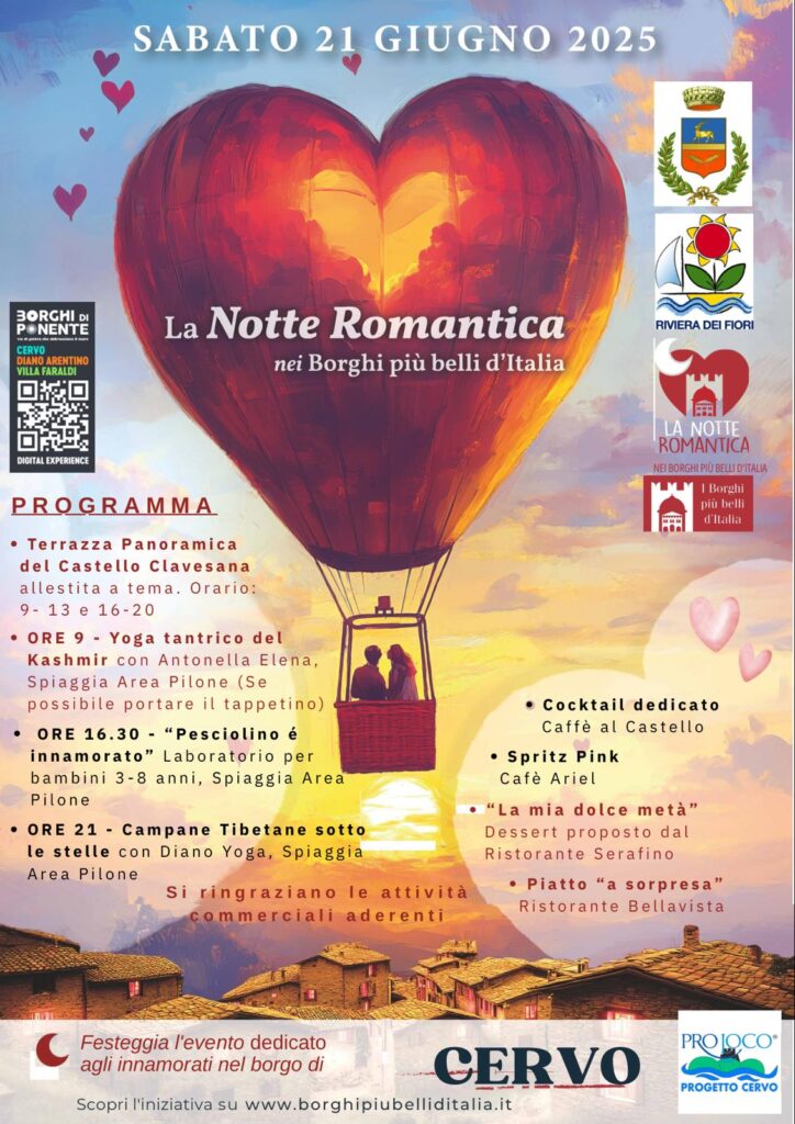 Sempre sabato 21 giugno il borgo di Cervo ospiterà la Notte Romantica, evento nazionale dedicato agli innamorati e alla magia dell’estate nei piccoli gioielli d’Italia.