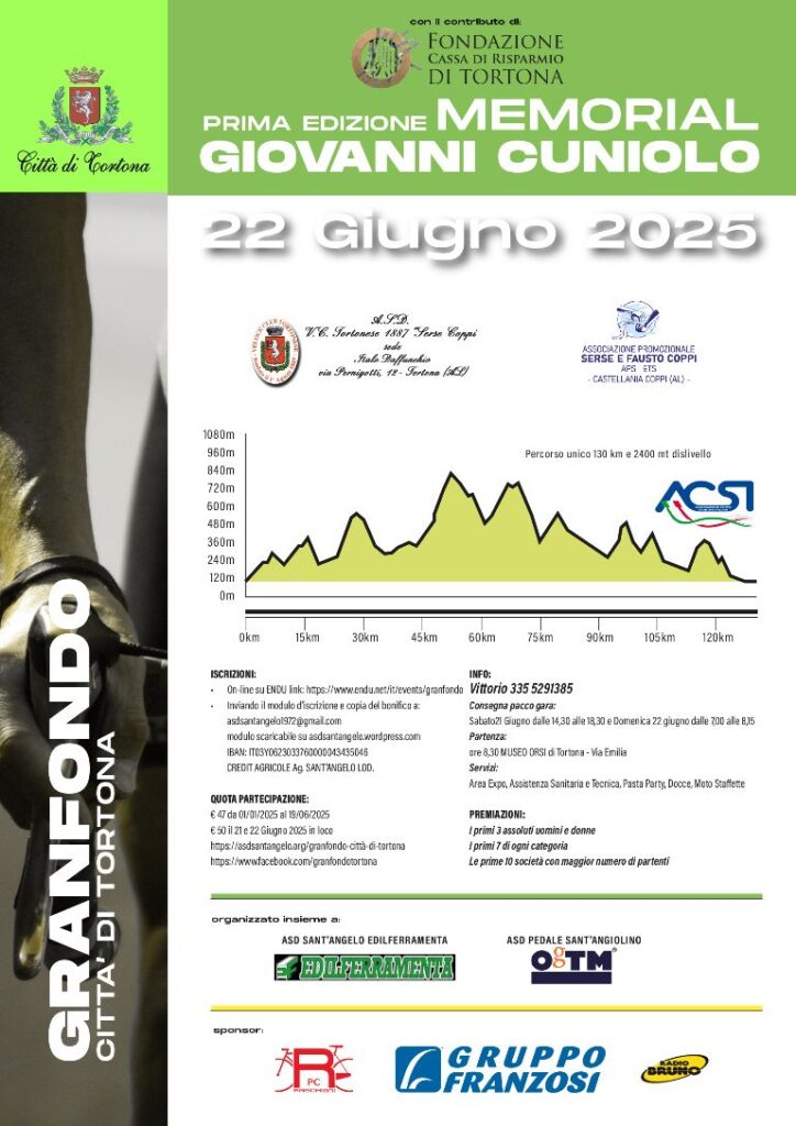 Domenica 22 giugno si terrà la prima “Granfondo Città di Tortona – Memorial Giovanni Cuniolo”, promossa dall’Amministrazione Comunale di Tortona con il contributo della Fondazione Cassa di Risparmio di Tortona e la sponsorizzazione della società Franzosi S.p.A, in sinergia con l’organizzazione dell’ASD Sant’Angelo Edilferramenta. La gara ciclistica amatoriale vuole rafforzare il legame profondo tra la città di Tortona e la grande storia del ciclismo, ricordando la figura di Giovanni Cuniolo, professionista tortonese tra il 1904 e il 1913, vincitore, tra le gare disputate, di tre titoli italiani di ciclismo su strada 1906, 1907, 1908.