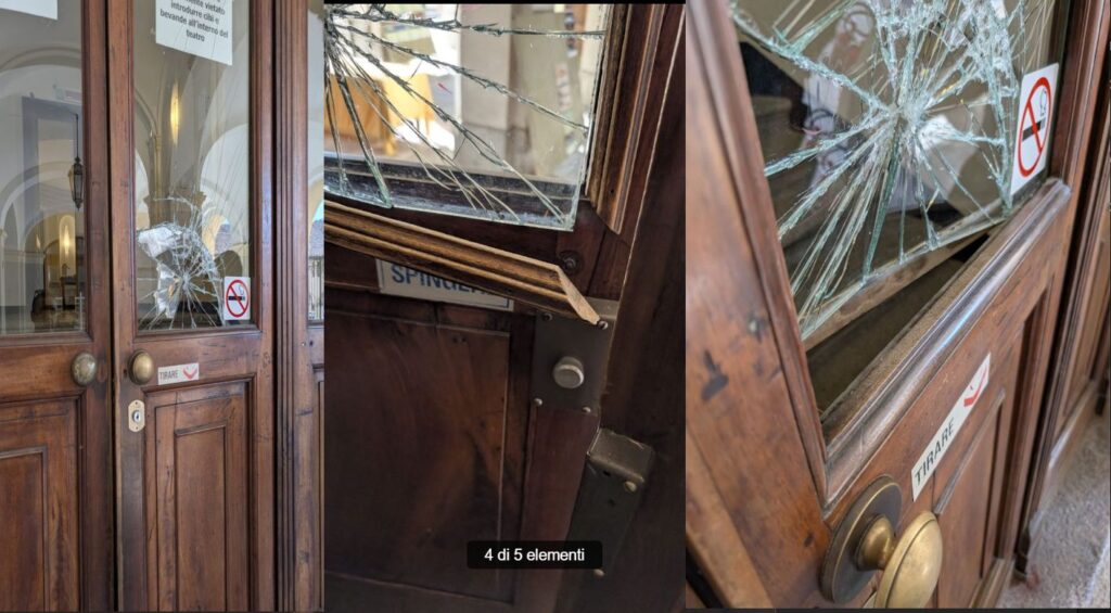 I cancelli sono chiusi, ma i vandali – forse una banda di sbadati – non hanno timore: scavalcano la recinzione in ferro del cortile dell’Annunziata, in pieno centro storico cittadino, prendono un estintore che per legge si trovava all’esterno dell’edificio, spaccano il vetro della porta d’ingresso del Teatro Civico di Tortona, aprono la porta da dentro come si vede nei film ed entrano nell’atrio.
