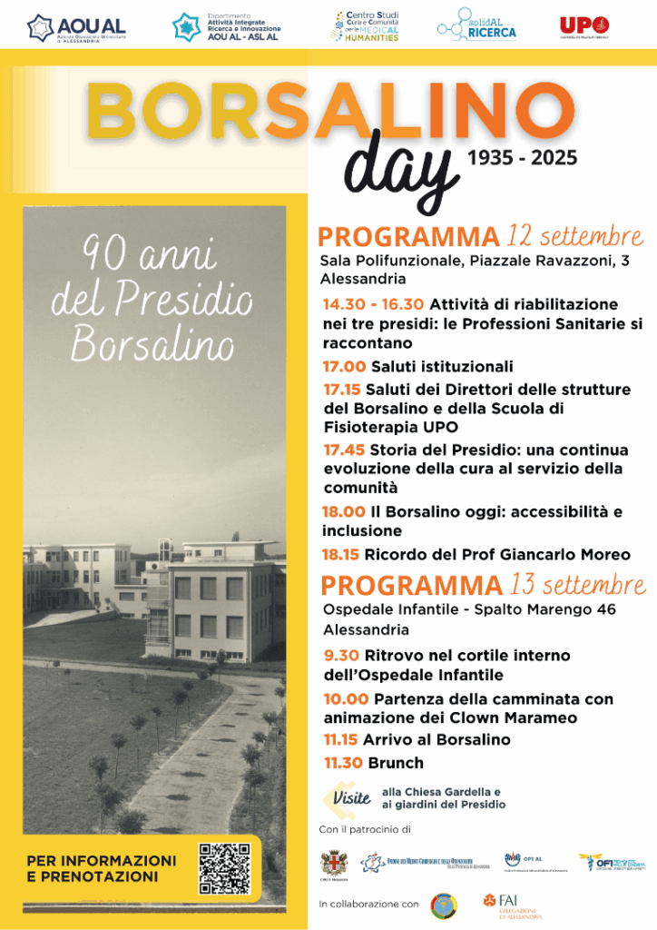 La due giorni dedicata al Borsalino Day 2025 inizierà venerdì 12 settembre dalle ore 14.30, con un pomeriggio aperto al pubblico che intreccia divulgazione scientifica, riflessione istituzionale e memoria. L’iniziativa si inserisce nel programma delle celebrazioni per i 90 anni del Presidio Riabilitativo “Borsalino” dell’Azienda Ospedaliero-Universitaria di Alessandria.