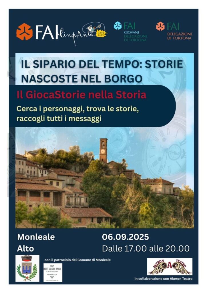 Grazie alla collaborazione con la compagnia teatrale Akeron Teatro faremo un viaggio nel tempo attraverso diverse epoche storiche nella cornice del suggestivo borgo di Monleale Alto. 🎭