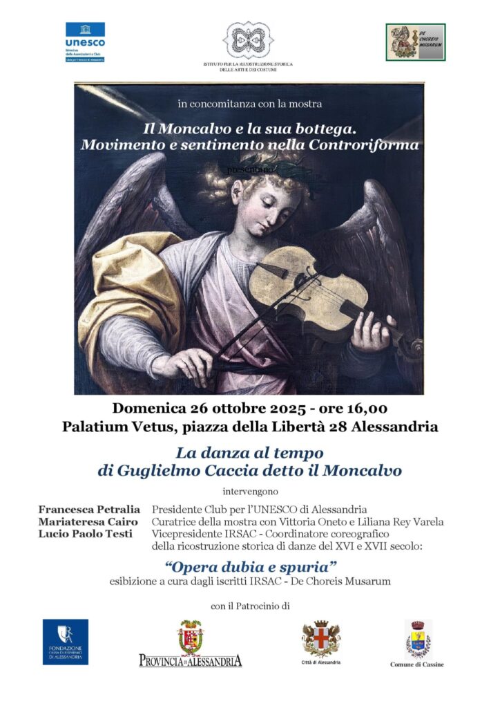 Alessandria, domenica 26 ottobre p.v., alle ore 16,00 presso Palatium Vetus, piazza della libertà 28 in concomitanza con la mostra “Il Moncalvo e la sua bottega: Movimento e sentimento nella Controriforma” organizzata dalla Fondazione Cassa di Risparmio di Alessandria si svolgerà la manifestazione “La danza al tempo di Guglielmo Caccia detto il Moncalvo” che prende spunto dall’esposizione delle opere del pittore monferrino per approfondire la conoscenza della società del XVI-XVII secolo, in particolare per quanto concerne la danza, la musica e l’abbigliamento.