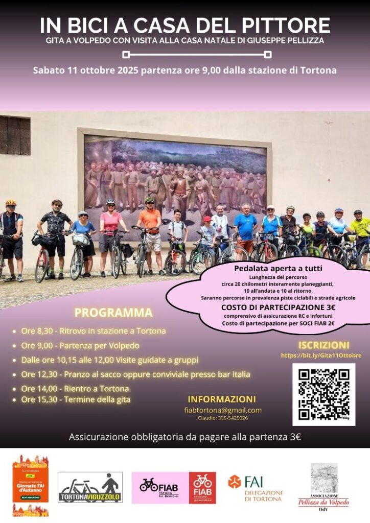 FIAB Tortona sezione Malabrocca organizza per sabato 11 ottobre 2025 una pedalata facile e aperta a tutti da Tortona a Volpedo, in concomitanza con la Biennale Pellizziana e le giornate FAI di autunno 2025.