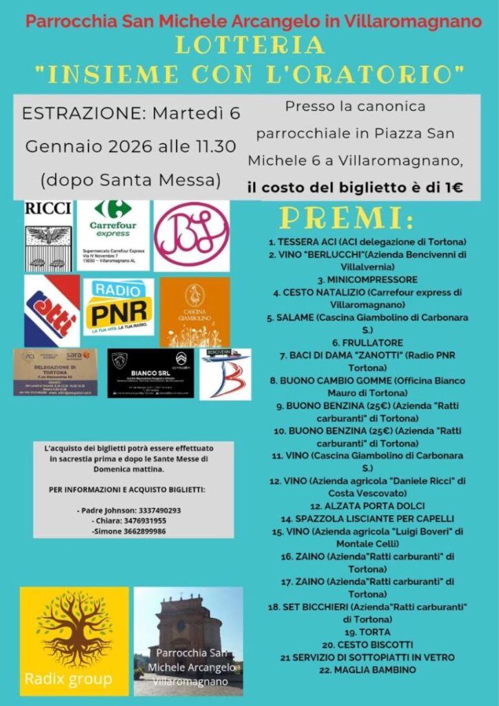 Tanto è stato fatto grazie all’aiuto di diverse persone che vogliamo ringraziare! L’oratorio è aperto il Venerdì dalle 15 alle 19 e la Domenica dalle 11 alle 12. L’estrazione si svolgerà Martedì 6 Gennaio 2026 alle ore 11.30 presso la canonica di Villaromagnano (AL). Per acquistare i biglietti (costo 1€) potrai contattare i seguenti numeri: 333-7490293 (Padre Johnson), 347-6931955 (Chiara), 366-2899986 (Simone). I premi sono 24, di vario genere. Si ringraziano i vari sponsor che sostengono l’iniziativa.