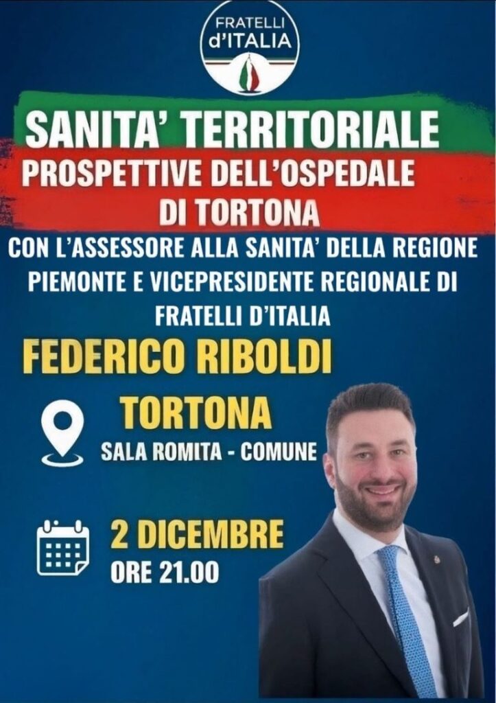 “Sanità territoriale – Le prospettive dell’ospedale di Tortona.” È questo il titolo di un importante convegno con la presenza dell’assessore regionale alla sanità Federico Riboldi, che si terrà martedì 2 dicembre alle ore 21:00 presso la sala Romita del municipio di Tortona. Si tratta di un importante intervento promosso da Fratelli d’Italia di Tortona, dove si illustreranno le prospettive future dell’ospedale.