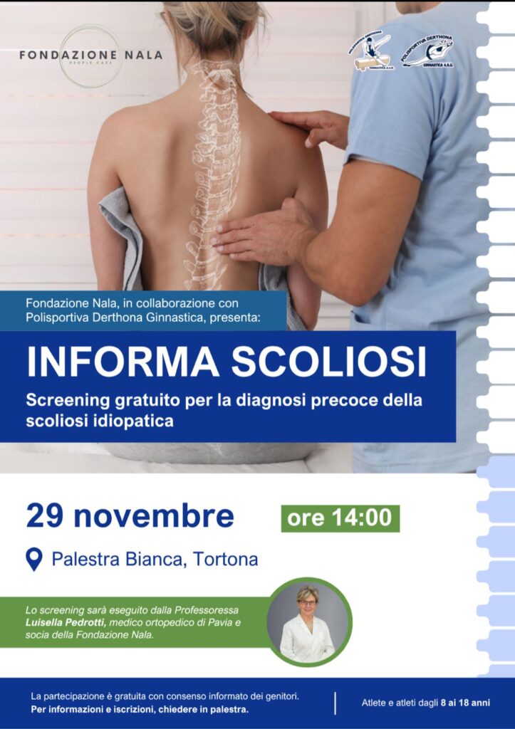Sabato 29 novembre alle 14.00 si terrà il terzo appuntamento del progetto “Informa Scoliosi”, promosso da Fondazione Nala, Ente del Terzo Settore con sede a Tortona.                   L’iniziativa, avviata con successo con le atlete e gli atleti della Polisportiva Derthona Ginnastica Artistica, nasce con l’obiettivo di promuovere la salute posturale di bambini, bambine e adolescenti in età evolutiva.