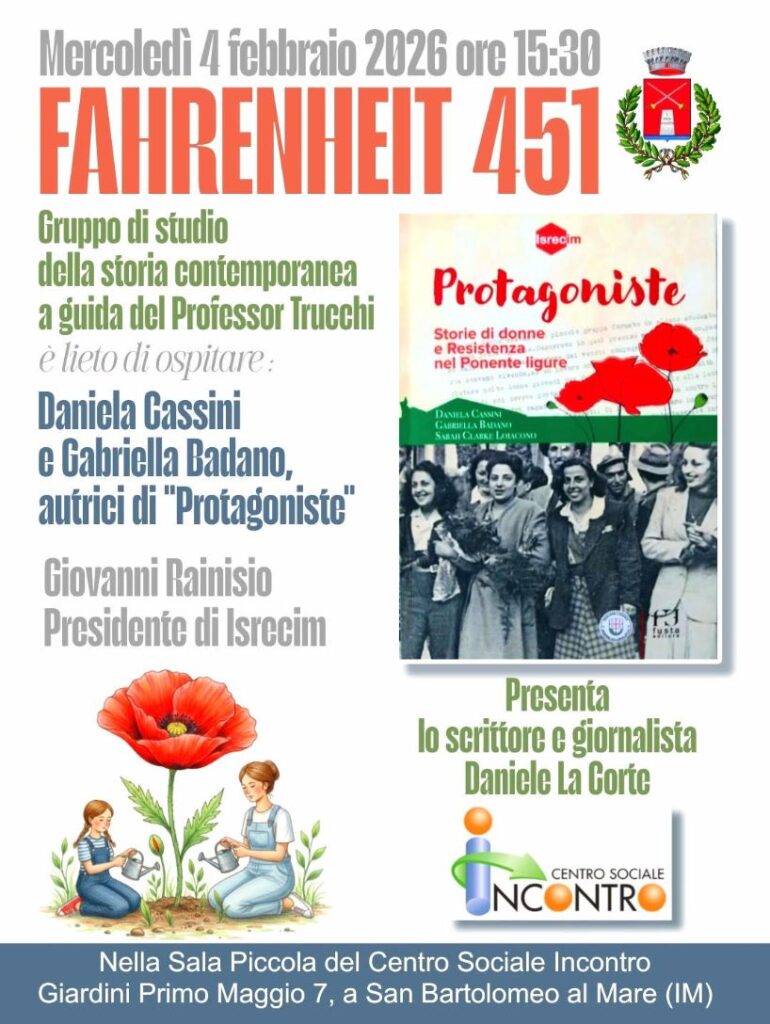 Mercoledì 4 febbraio, a partire dalle ore 15:30, a conclusione del ciclo “Fahrenheit 451”, il gruppo di studio della storia contemporanea guidato dal professor Edoardo Trucchi, ospiterà Daniela Cassini e Gabriella Badano, autrici, con Sarah Clarke Loiacono, del libro “Protagoniste”, edito da Fusta per Isrecim, l’Istituto Storico della Resistenza e dell’Età Contemporanea di Imperia. L’incontro si concentrerà sul giusto riconoscimento del ruolo femminile nella Resistenza. Sarà presente anche l’On. Giovanni “Beppe” Rainisio, Presidente di Isrecim. L’incontro si terrà nella saletta al pianterreno del Centro Incontro, in Giardini Primo Maggio, 7 a San Bartolomeo al Mare (IM)