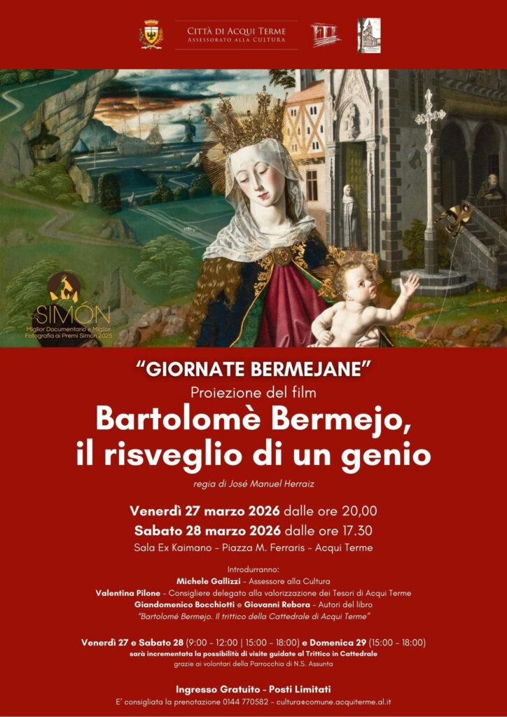 La Parrocchia di N.S. Assunta, in collaborazione con il Comune di Acqui Terme, organizza, nelle giornate di venerdì 27 marzo alle ore 20,00 e, in replica, sabato 28 marzo alle ore 17,00, preso la Sala Ex Kaimano in Piazza M. Ferraris ad Acqui Terme, la proiezione del film “Bartolomé Bermejo: il risveglio di un genio”, che esplora la vita del pittore, focalizzandosi in un intreccio appassionato delle sue opere, tra cui figura il celebre Trittico della Cattedrale. Prima della visione, il Dott. Giandomenico Bocchiotti e il Dott. Giovanni Rebora, in qualità di storici locali ed autori del libro “Bartolomé Bermejo. Il trittico della Cattedrale di Acqui Terme”, parleranno dell’affascinante storia di quest’opera d’arte e faranno un’introduzione al film del regista spagnolo José Manuel Herraiz.