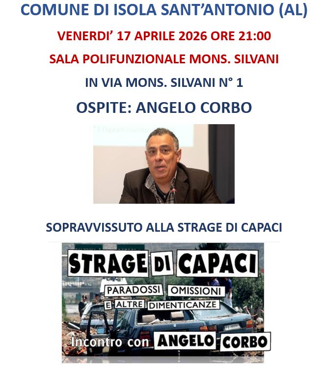 Un avvenimento importate si terrà ad Isola Sant’Antonio organizzato dal Comune: venerdì 17 APRILE 2026 alle ore 21:00 presso la sala polifunzionale “Mons. Silvani” in via Mons. Silvani sarà ospite della serata il Sig. ANGELO CORBO, Agente di scorta di Giovanni Falcone, sopravvissuto alla strage di Capaci.