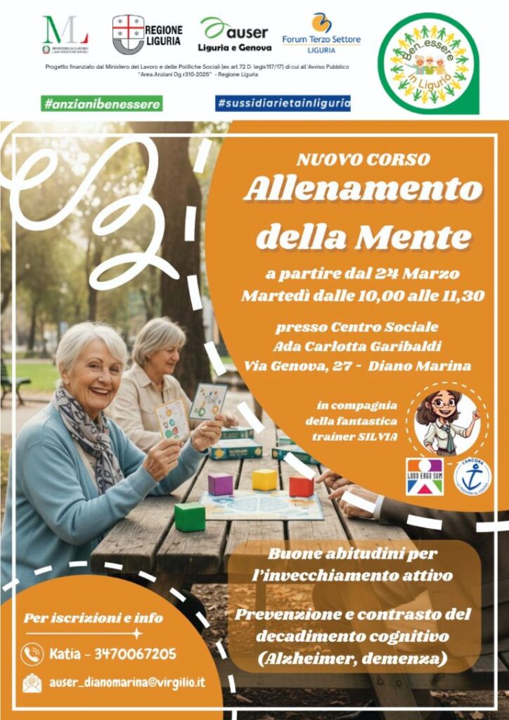 Prende il via a Diano Marina un’importante iniziativa dedicata al benessere della terza età: il nuovo corso di “Allenamento della Mente”. Promosso da Auser Liguria e Genova, in collaborazione con Regione Liguria, Forum Terzo Settore Liguria, Ben.essere in Liguria, L’Ancora e Ludo Ergo Sum, il progetto mira a sostenere l’invecchiamento attivo e a contrastare il decadimento cognitivo.