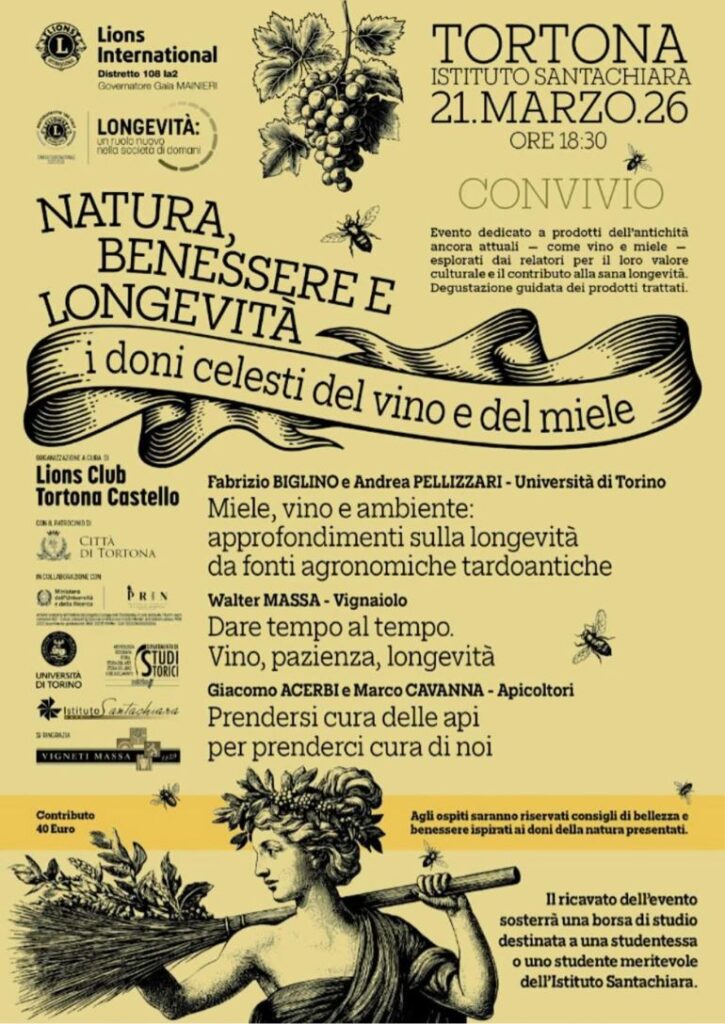 Il Lions Club Tortona Castello e l’Istituto Santachiara, insieme per una magica serata, che permetterà di finanziare una borsa di studio per uno studente/studentessa meritevole dell’Istituto cittadino. Relatori d’eccezione del convivio i docenti universitari Fabrizio Biglino e Andrea Pellizzari, il vignaiolo Walter Massa, gli apicoltori Giacomo Acerbi e Marco Cavanna, che ci delizieranno, fra una portata e l’altra, con notizie e curiosità su antiche ricette e, come diceva Virgilio, sui”doni celesti del vino e del miele”, in vista di una sana longevità.