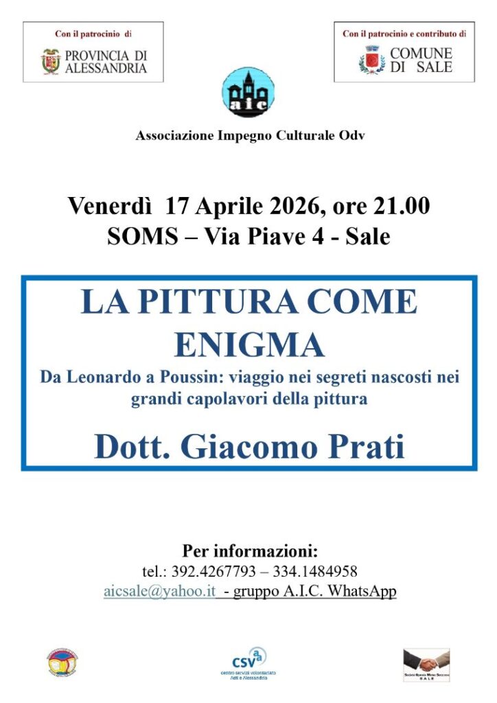 Appuntamento culturale di rilievo, alla SOMS di Sale venerdì prossimo, 17 aprile, alle ore 21. Il Tortonese Giacomo Maria Prati, infatti, terrà una conferenza su cinque opere pittoriche tra le più difficili da interpretare: