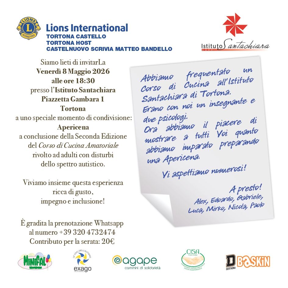 L’ 8 maggio è una data da memorizzare perchè legata, come l’8 maggio dello scorso anno, all’impegno lionistico in favore degli adulti con disturbi dello spettro autistico, che hanno frequentato il Corso di Cucina Amatoriale a loro riservato presso l’Istituto Santachiara. I sette alunni, alla fine del corso organizzato dai Lions Club Tortona Castello, Tortona Host e Castelnuovo Scrivia Matteo Bandello, sono ansiosi di dimostrare quanto hanno imparato con un’apericena nel salone dell’Istituto, invitando a vivere insieme questa loro esperienza, ricca di impegno, gusto ed inclusione.