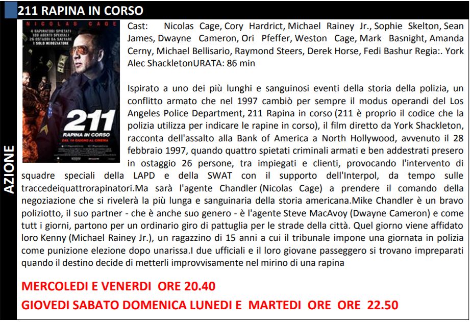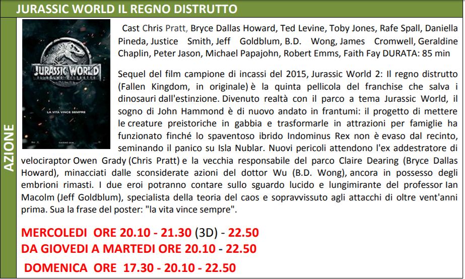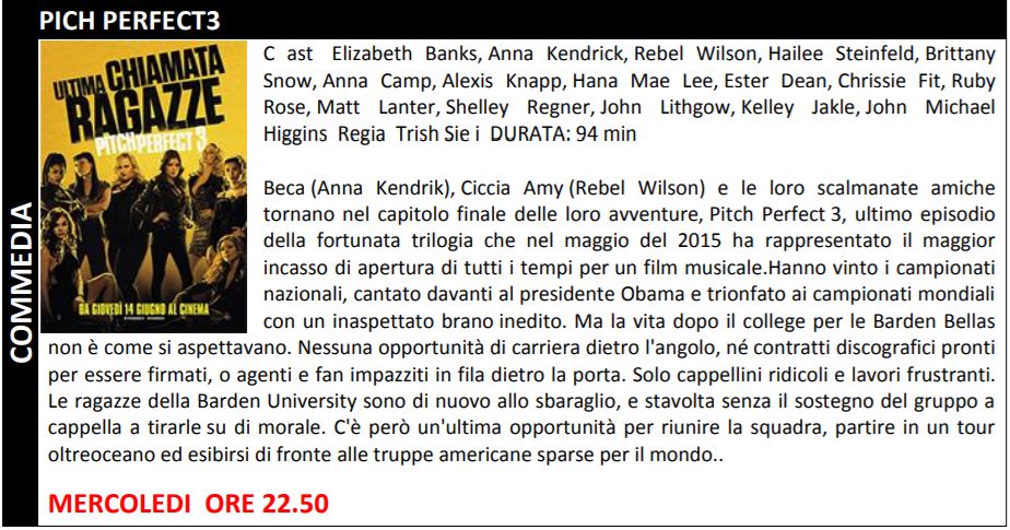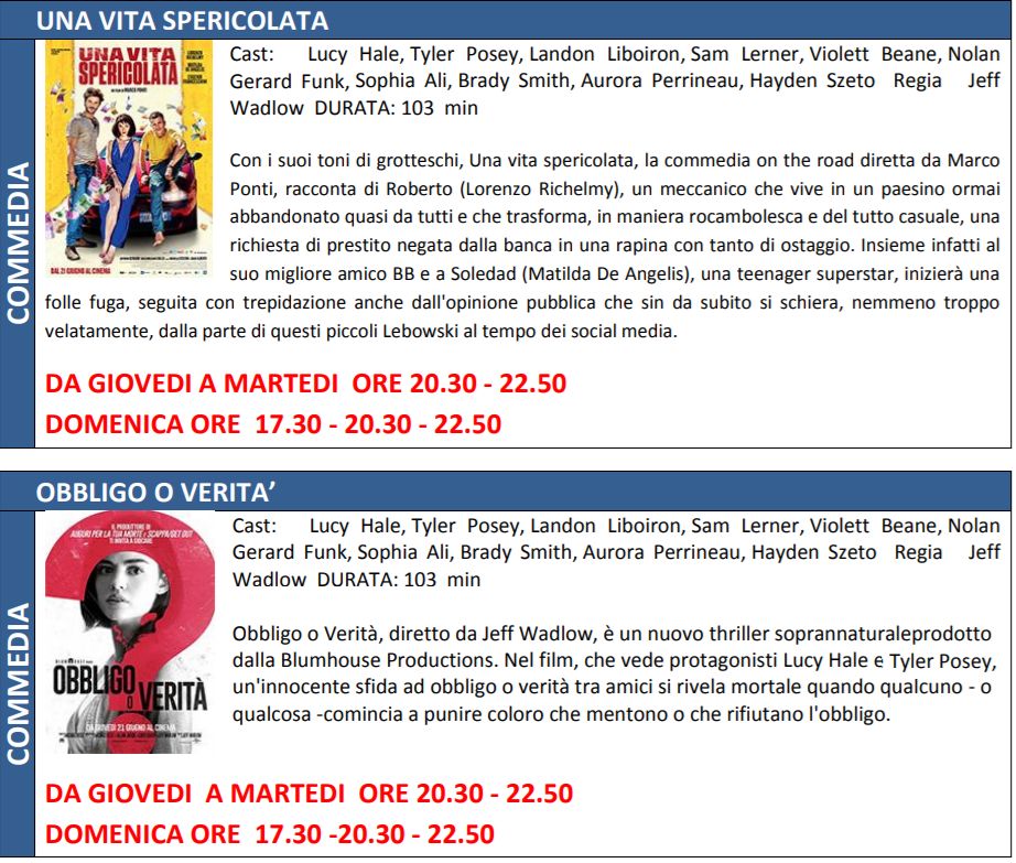 per il resto, si seguito tutte le trame e gli orari della programmazione. Ricordiamo che da questa settimana fino alla fine di agosto il sabato la multisala non apre più il pomeriggio ma soltanto la sera.