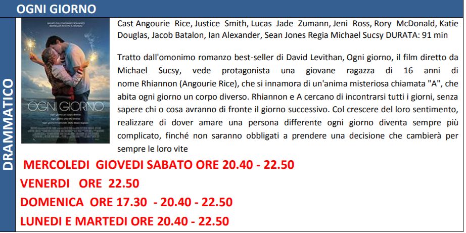 Malgrado l’estate, solitamente, non presenti film di eccelso livello, la multisala Megaplex Stardust di Tortona propone questa settimana una programmazione di tutto rispetto. Per chi non lo ha ancora visto, suggeriamo di non perdere “Ogni giorno” bel film fantasy.