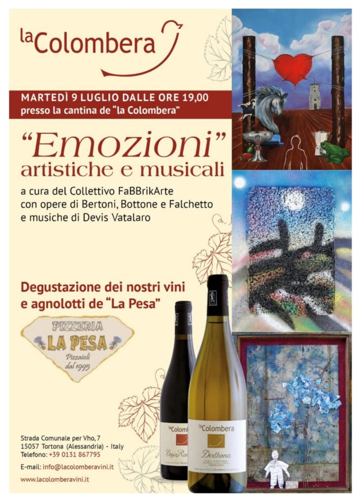 Nell’ambito della tradizionale festa della Cantina “La Colombera” di Vho, che quest’anno si tiene nella serata di martedì 9 luglio a partire dalle ore 19, la titolare, Elisa Semino, è lieta di ospitare un evento di carattere artistico e musicale organizzato dal Collettivo FaBBrikArte, un sodalizio degli artisti Fabio Bertoni, Roberto Bottone e Fabrizio Falchetto.