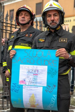 All’ispettore dei vigili del fuoco sig. Suppa, è stato consegnato un cartellone da parte dei bambini della scuola “Sacro Cuore” raffigurante i tre giovani in una nuvoletta che passano la manichetta ai loro compagni in terra per spegnere un fuoco. Nell’omelia mons. Viola ha sottolineato come sia importante in questo momento, dove non ci sono logiche umane, affidarsi totalmente al conforto della Parola che “non è una risposta alle domande difficili che si agitano dentro la nostra mente e nel nostro cuore ma che è un fatto: la certezza che Dio è un Dio dei viventi, Lui non abbandona nessuno alla morte. Il nostro ricordo non vuole confinare i tre giovani in un tempo passato perché li crediamo vivi in Cristo per la nostra fede. Il nostro ricordo si fa gratitudine a Dio per il dono che loro sono stati e sono perché la loro testimonianza continua. Lasciamoci tutti guardare dallo sguardo materno della Vergine Maria che come madre accoglie il nostro dolore, ci consola parlando a noi del Figlio suo morto e risorto per noi.