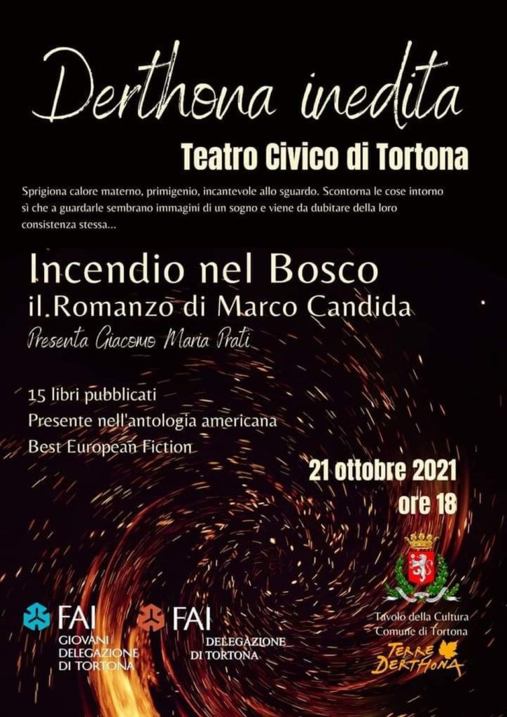 Nuovo appuntamento con la cultura domani, giovedì 21 ottobre alle 18 a Tortona. Presso il Teatro Civico in via ammiraglio Mirabello nell’ambito della rassegna “Derthona inedita” si terà la presentazione del romanzo di Marco Candida “Incendio nel bosco“ presenta Giacomo Maria Prati.