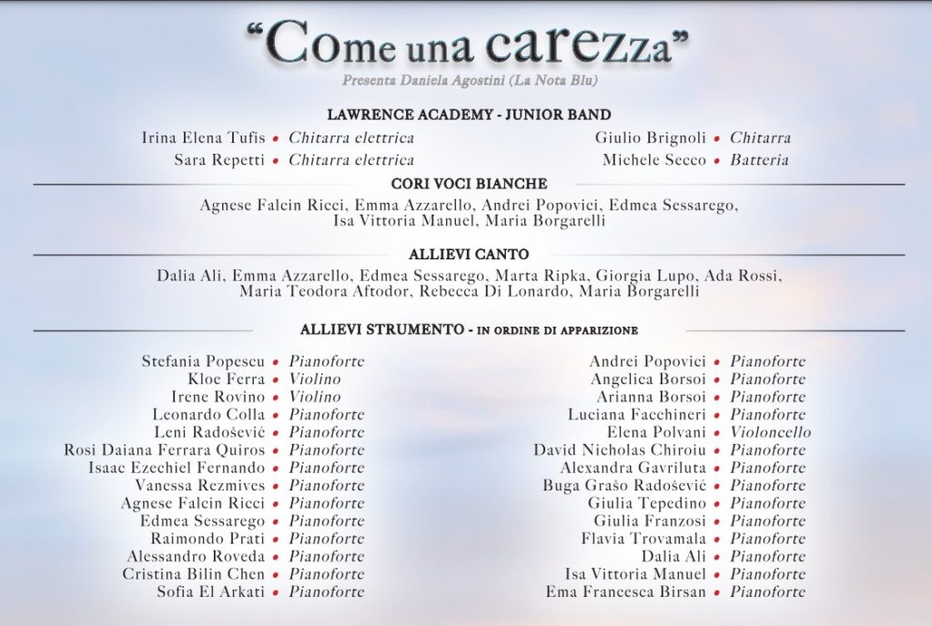 Si esibiranno gli allievi dell’Accademia guidati dai maestri Margherita Fratini (violino), Tania Furia (canto), Gian Maria Franzin (pianoforte), Thierry Zins (chitarra), Riccardo Tosino (batteria), Alberto Ricci (pianoforte), Silvio Verri (violoncello), Luca Naclerio (pianoforte).